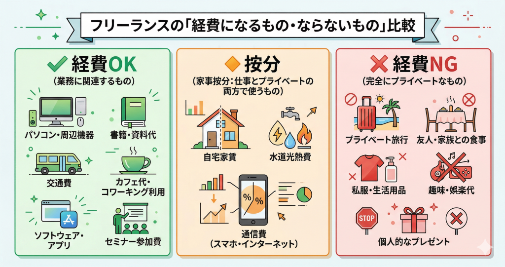 たとえばカフェでの作業は「仕事のためだった」と主張できますが、同席した友人の飲食代は経費になりません。自宅兼事務所の家賃も「全額」ではなく、仕事に使用している割合(按分)のみが経費として認められます。詳しくは後述の「経費OK/NG一覧」を参考にしてください。